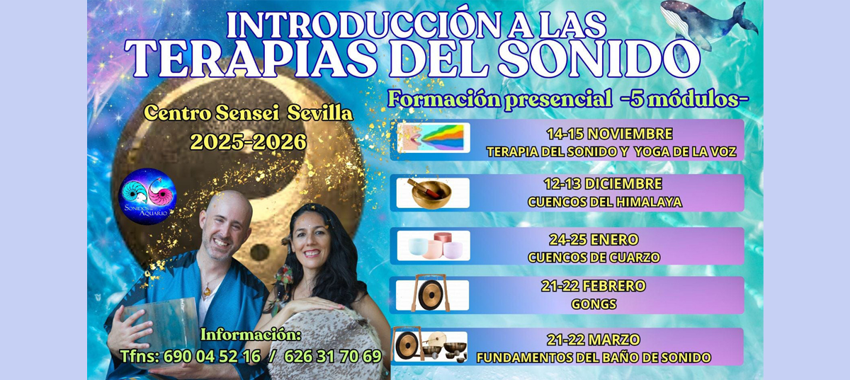 Luis Rodríguez y Sara Moguer ofrecen con este curso una completa iniciación en la medicina del Sonido. La Formación, estructurada en cinco módulos, plantea un primer acercamiento a algunas de las principales herramientas utilizadas en la sonoterapia: la voz, los cuencos del Himalaya, los cuencos de cristal de cuarzo, los gongs y el tambor. Al finalizar la formación, los alumnos estarán capacitados para utilizar dichos instrumentos en sesiones individuales y grupales de sonido, pudiendo también integrarlos en otras modalidades terapéuticas tales como la meditación, el reiki, el qigong o el yoga.